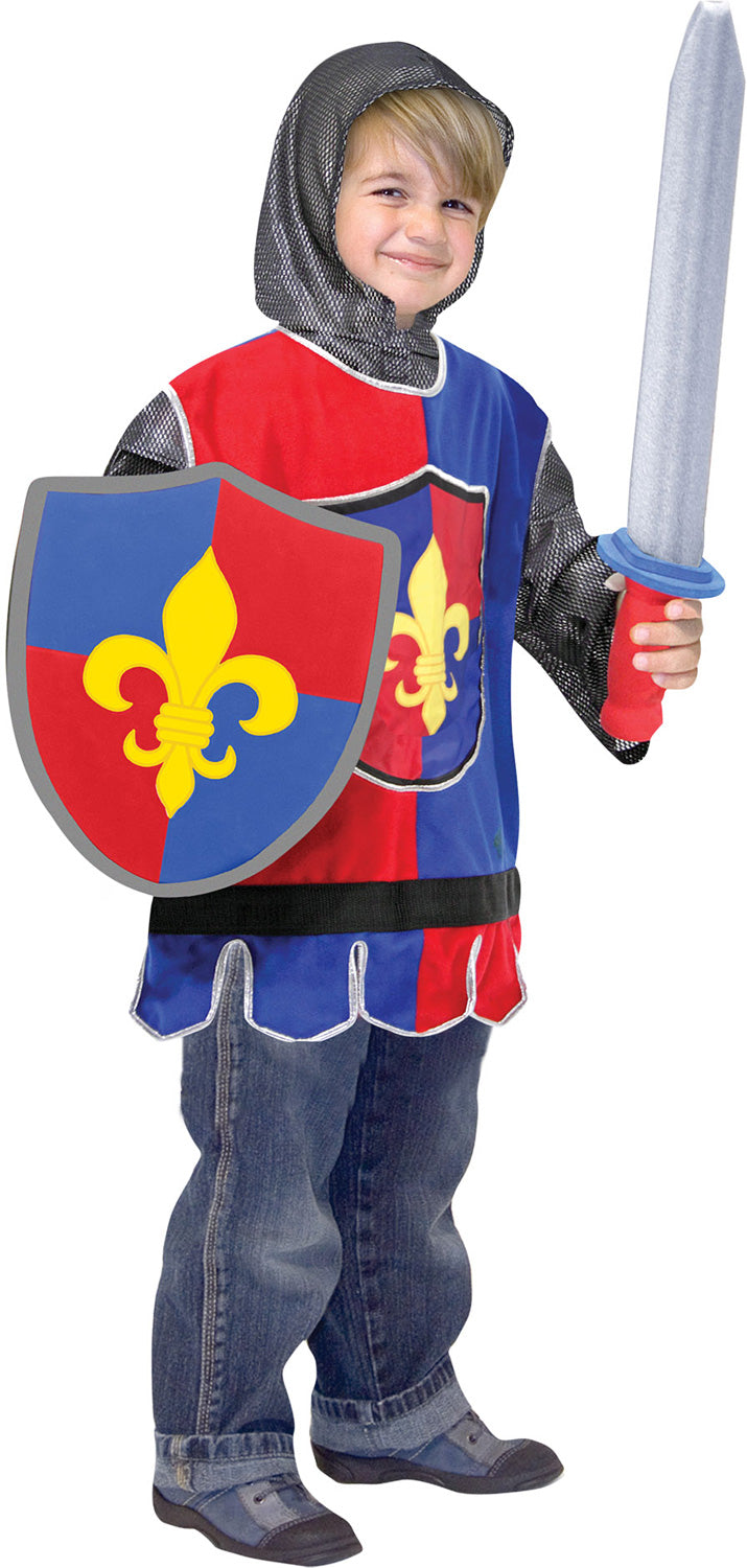 The outfit includes an embroidered felt tunic with felt closures for a comfortable fit, a "chain link" fabric hood and sleeves, and a durable soft sword and shield -- perfect for slaying those dragons. The role play outfit is sized to fit boys and girls ages three to six. The high-quality fabrics and solid construction ensure durability so your kids can wear it over and over again. The tunic can be machine washed, and it comes with accessories that can easily be wiped clean. With authentic medieval details, these role-play accessories encourage lots of exciting pretend play for noble young ones! The costume set helps promote narrative thinking and creative expression, along with independent and cooperative play. It makes a great gift for kids ages three to six for hands-on, screen-free play.